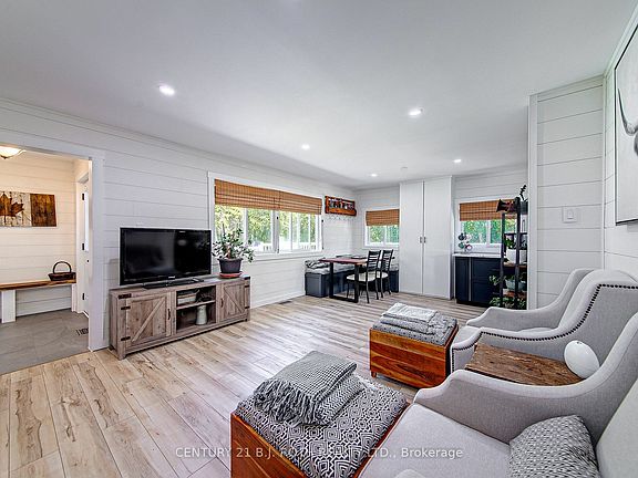 Bright Open Concept Raised Bungalow walking distance to Lake Simcoe. All sorts of peaceful walking trails. Rail Trail around the corner and waterfront trail along the lake. This home boasts gleaming laminate flooring throughout, in ceiling lighting in living room, ship lapped and new trim and inside doors throughout main floor. Totally renovated kitchen cabinets, countertop, sink. All new (2022) appliances - Fridge, Stove, Dishwasher, Washer and Dryer. Walk out to fully fenced private back yard and deck for those peaceful evenings. Raised Vegetable gardens. Fully finished basement has separate entrance and walk out to side yard - Perfect for in law capability. 8 foot ceilings. Huge Recreation room . Bathroom renovated with new vanity / sink and toilet. You wont be disapointed in this . Other upgrades are new Sump pump, furnace, water pressure tank, and UV light. Hot Water on Demand. Another added bonus is the Generac Generator. Electric awning and leaf guard. IN LAW POTENTIAL WITH WALK UP