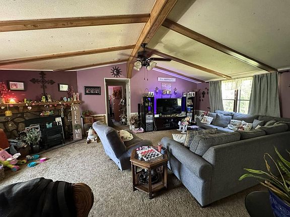 Move-in-ready double-wide mobile home on a permanent foundation, offering over 1400 sq. ft. of comfortable living space on approximately 1 acre of land. This property is a gardener's dream, providing the perfect opportunity to create your own garden oasis. Featuring an open floorplan with vaulted ceilings, a gas log fireplace, a separate dining room, and a kitchen bar, this home exudes warmth and charm. The covered porch at the back offers a private and level area ideal for relaxation and gardening. With three storage buildings on the property, one of which can be utilized as a workshop or a one-car garage, you'll have ample space for all your needs. An above-ground pool adds to the enjoyment, perfect for swimming and entertaining. The fully fenced yard ensures privacy, making this a perfect retreat. This home is priced right and offers excellent value for those seeking a serene, private, and spacious property. Don't miss out on this unique opportunity!