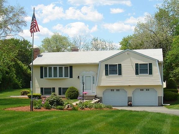Sunny Split Entry ranch centrally located on two gently rolling acres of lawn, gardens, and stone wall adjacent to conservation land in desirable Southborough neighborhood. Living room with bow window, brick fireplace and hard wood floors. Dining room with hard wood floor and chandelier adjacent to kitchen. Sun splashed kitchen with wood cabinets,range, refrigerator and dishwasher. Sun room with updated windows, bow window, and electric heat. Three bedrooms with hardwood floors. One and one half baths. Lower level family room with fireplace, built in storage, wainscotting, and tile floor. Two car garage. Fenced inground pool with deck, pool house, and garden area. Herb and flower gardens with adjacent storage shed. Updated doors, garage doors and windows. Carefree vinyl siding. Convenient to all location. Welcome home to a special home!