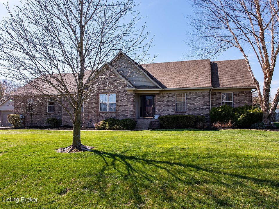 Immaculately maintained 1 Story Ranch in Highly desired Majestic Run. If you are looking for an all brick, incredibly clean Ranch style home with nearly 3/4 of an acre, this is for you. Enter through the front door and immediately notice the hardwood floors and spacious formal living area that flows into the dining room. Perfect for those family holidays. There is a second great room with a built in bar/entertainment area adorned with crown molding, solid surface floors and open to the breakfast area in the kitchen. Three very spacious bedrooms including a large Primary Suite with trey ceiling, makeup counter top and jetted tub. THE BACK YARD! This home comes complete with wonderful fenced in and flat back yard perfect for the babies (fur and not). A remarkable separate 2 1/2 car garage in addition to the 2 1/2 car garage on the side of the home is perfect for a wood shop or those toys. Above ground pool, New Mechanicals (HVAC, Waterheater), close to Shepherdsville and I-65, parks, dining shopping and so much more.. HURRY!