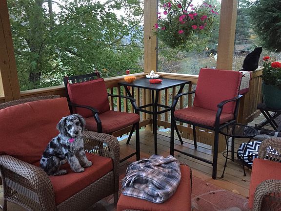 2 story wood frame house with loft and two porches. Large sitting/rec room with many windows and wood stove. Two Living rooms with fireplaces. Covered Patio with hottub.
