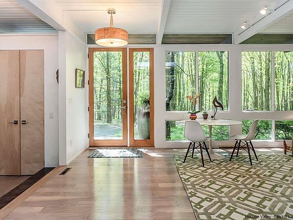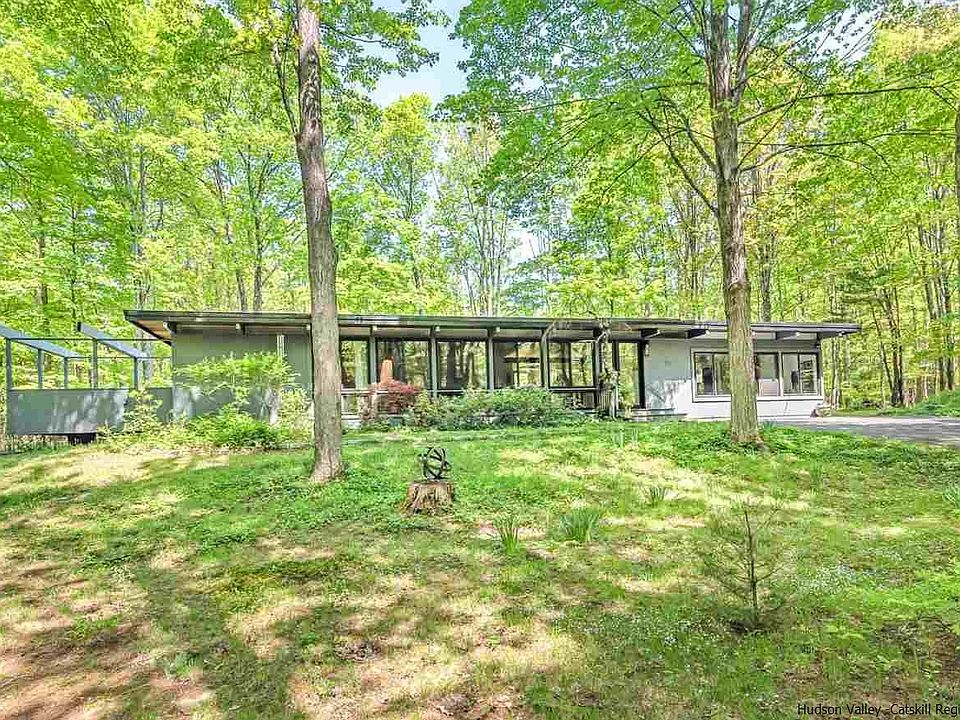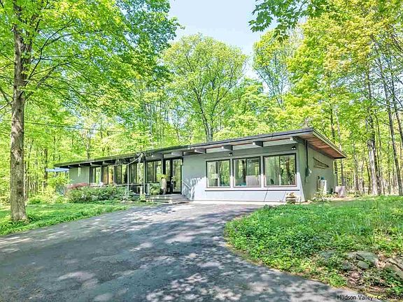 Down a long, blacktopped driveway lies this tastefully restored mid-century modern gem with loads of original detail. Including clerestory windows throughout, some vintage lighting, 9 ft. beamed wood ceilings, original tiled fireplace, and floor to ceiling glass. Totally renovated from top to bottom, this one level home with 2 bedrooms, 2 full baths and 2160 sq ft. has it all! The gourmet kitchen showcases stainless steel upper Euro-style cabinetry, stainless appliances, white quartz countertops, a gorgeous metal backsplash with a potfiller over the stove. A great chef's kitchen. The recent renovation included all new floor to ceiling energy efficient windows and doors, new rubber roof with insulation, and all new bathrooms and kitchen. MBR has a large walk-in closet, large bath with a 5 ft. shower and double sinks. French doors off the master lead to a large, private, sunny deck. Both bedrooms have their own bathrooms and 2nd bath has a jetted tub. The home has walnut and concrete flooring with radiant heat, central A/C and central vac. This is a wonderful entertaining space and has an open floor plan. The main rooms open to each other for easy access and the house itself flows into it's surroundings effortlessly, due to the floor to ceiling glass which takes in the wooded setting which includes 33 acres of DEP protected land. You feel enveloped by nature with all it's sights and sounds. A mid-century modern like this is a rare find!