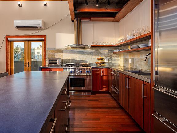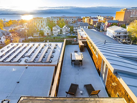 A singular condominium residence located on the top floor of Burlington's Iconic, Copper-Clad Hood Plant building. This west facing unit offers tremendous architectural character, elegant finishes, an open & airy floor plan with an 18' high contoured ceiling in the main living area an 11' tall windows providing gorgeous views of Lake Champlain, the Adirondacks and the Queen City. At 1825 sq. ft. this home has ample living space and an open floorplan with excellent flow between kitchen, dining and living areas. Remodeled kitchen has great storage, a Thermador range and stylish concrete and stainless counters. There are 2 bedrooms downstairs. The renovated owners' bedroom combined 2 smaller rooms and now offers a broad walk-in closet. The stunning full bath has a massive whirlpool tub, remodeled walk-in shower and exquisite tile throughout. Upstairs you'll find an open loft area overlooking the living space complete with remodeled 3/4 bath. A great space for an office or guest quarters. This unit has incomparable outdoor space including 3 separate terraces with their own distinct feel. A North terrace off the kitchen is great for cooking and taking in Burlington, a terrace off of the 2nd bdrm and living room provides exceptional western views and the spacious upstairs terrace has broad open space, concrete bar, outdoor shower and room to entertain or lounge as you take in the spectacular sunsets over the Adirondacks. A true Gem in the heart of Burlington. Take a look today!