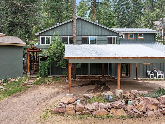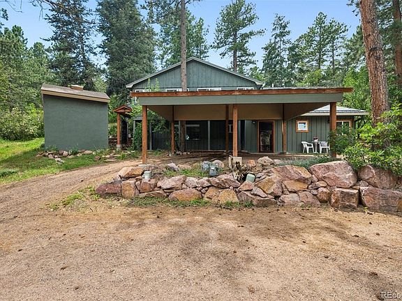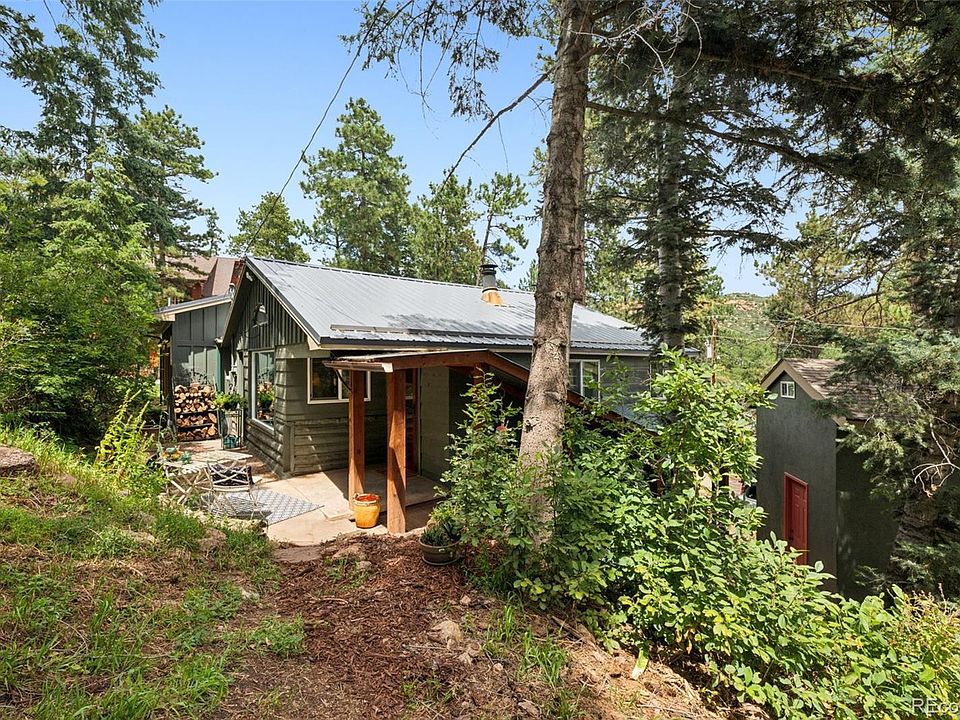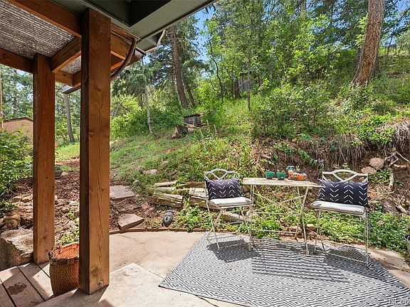 Palmer Lake charming and fully updated! This wonderful home on a quarter acre in Palmer Lake has been updated and has two separate living spaces! The main living area has vaulted ceilings, a wood burning stove, original peeled log on some walls and loads of natural lighting! The kitchen is charming with white cabinets, wood look counters, double ovens and gas stove! The spacious dining area has room for cabinets and seating area as well as a long dining table! The first of two laundry areas is on the main level as well as an updated 1/2 bath! Your private master retreat has plank flooring, walk in closet with window and walks out to your private patio in the trees! Private on suite bath as well! The basement of the main house has a second bedroom being used as an office and has an attached bath with clawfoot tub. The second living space is perfect for multigenerational living with a newly added kitchen, family room, private bedroom and a third bath! Plank flooring, new kitchen cabinets, wood on the vaulted ceilings and loads of storage! A second laundry area, mud bench and enclosed private entry and access to the main areas allow for easy secondary living! Attic storage and crawl space storage as well! Three storage sheds on the property and parking up above! Three separate patios for wonderful entertaining and fun places to enjoy the Palmer Lake lifestyle! Covered parking and extra parking for guests! Two washer/dryers and the main family room TV included! Newer metal roof and newer furnace.
