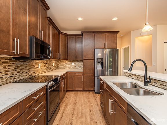 Easy Northwest living in desirable Jennie’s Meadow! This 2017 original-owner, Westerra-built 2-bed/2-bath townhome offers 1,350 SF of open-concept living with 9’ ceilings, faux hardwood floors, Quartz counters with island breakfast bar & stainless appliances. Enjoy the south-facing, private covered patio for sunny year-round indoor/outdoor living. Spacious primary suite with walk-in closet & dual-sink bath is separate from the guest room/bath. Interior laundry with utility sink, plus 2-car attached garage. "Lock & Leave" Lifestyle-Ready with many HOA-provided benefits for a low $439/Qtr (landscaping, common area/road maintenance, gutter cleaning...) Short walk to bus line, shops, dining, Olympic Discovery Trail & Railroad River Bridge Park.