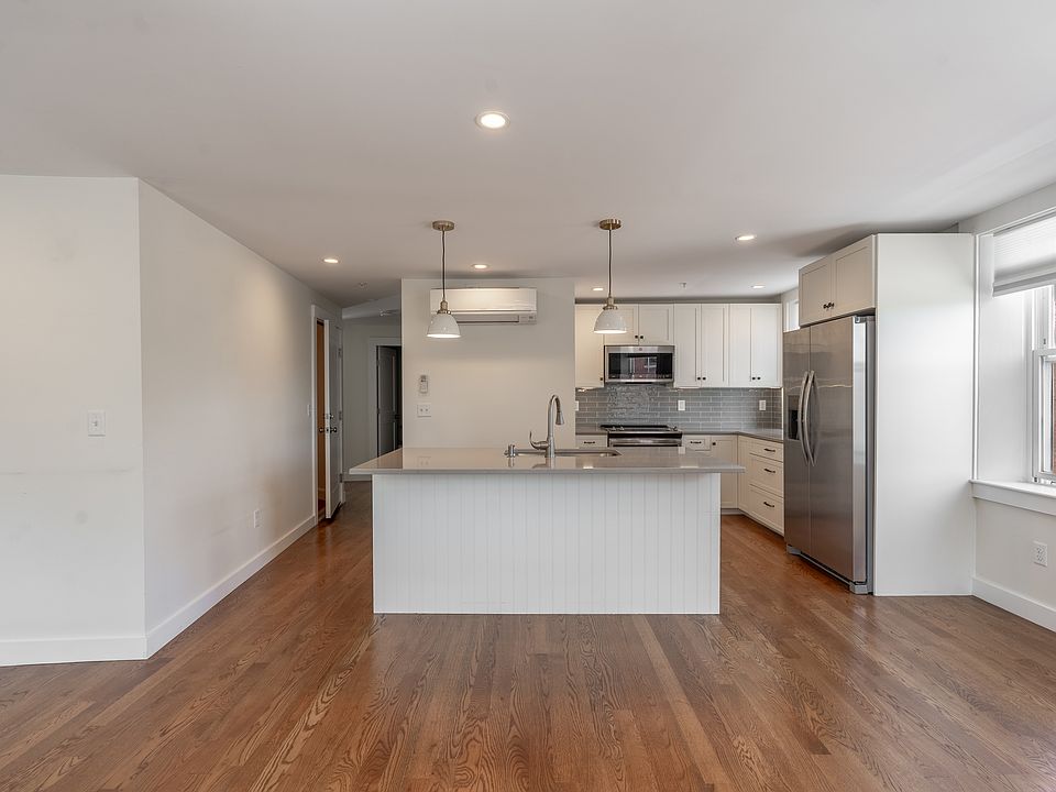 Desirable 1000SF Two Bedroom (full bath in each bedroom) in the heart of downtown Portsmouth! This immaculate apartment has 2 generously-sized bedrooms that contain each there own bathrooms. As you open the door you enter into the substantial sized living room with bright dining room with hardwood floors. Recently renovated and all new appliances throughout the apartment. Please call Aaron with number listed below for all Inquires and showings. Renter is responsible for heat, electric water and sewer