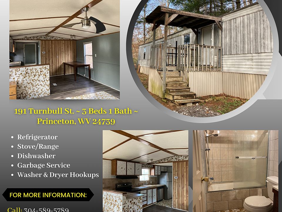 191 Turnbull St. ~ 3 Beds 1 Bath ~ Princeton, WV 24739 LEASE OPTION (Path to Home Ownership): Initial payment: $1,500 with no payments due until the 1st of the following month! Monthly payment: $725/month includes lot rent and trash service. or RENTAL: Security Deposit: $725. Can be made in payments if needed. Monthly payment: $725/month includes lot rent and trash service. Sorry, this home is not HUD approved. Semi-private 3 bedroom, 1 bath single wide mobile home for rent. Fenced in yard with outbuilding. Covered front porch. Surrounded by trees that give lots of privacy. Custom tile work throughout the home. Furnished with a stove, refrigerator and dishwasher. Separate laundry room area with washer & dryer hookup. Ceiling fans throughout. Central electric heat. Large, private, driveway that allows a lot of parking area just for your home. Located in Pinetree MHC in Glenwood, WV. Lot rent and weekly curbside trash pick up included in the monthly rent. Move in ready! Christian Management Corporation Office Hours: Mon, Wed & Fri 9:00AM-5:00PM & 10:00AM-2:00PM the 1st Saturday of every month You can view THIS property 7 days a week! Most pets welcome with a $300.00 pet fee per pet and signed pet agreement. Maximum 2 pets. No aggressive breeds due to insurance restrictions. Clean, safe, quiet, crime & drug-free are our priorities for our residents! We support Equal-Housing Opportunities! Good people with good, bad, low, or no credit but stable employment or Social Security are welcome. -MUST pass background check -NO evictions in the last 7 years -NO sex offenders Is this property not what you are looking for? View our other available #homes, #mobilehomes, #apartments, and more on our Facebook or our website!