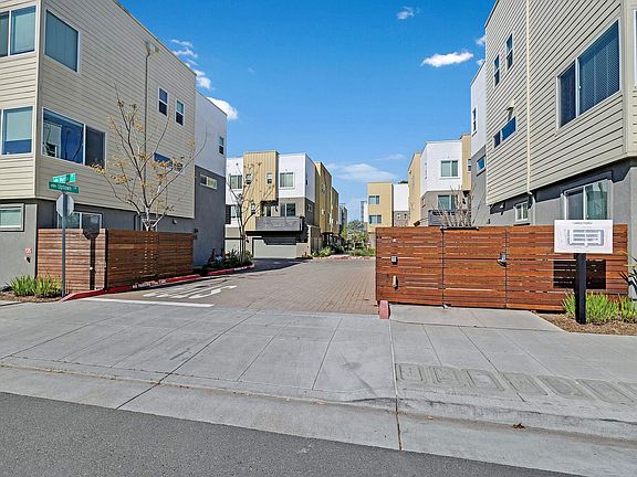Exquisite 3 bedroom 3 bathroom 1546 square feet townhome. Secure gated community built in 2020. Entrance to garage and Front door are inside of the gate, which is rare for this community. Abundant natural light. Stunning downtown Oakland views from the spacious private patio. High-end kitchen with quartz countertops, soft-close cabinets and an oversized island. Premium waterproof and scratch proof LVP flooring. Primary suite with two walk-in closets and a huge en-suite bathroom. Third bedroom and bathroom on the main level. High efficiency central AC with smart NEST thermostat. Owned solar panels, EV charging in the spacious garage. West Oakland BART station 8 min drive. SF Downtown 15-20 min drive. Direct Transbay shuttle at your doorstep. Come tour today!