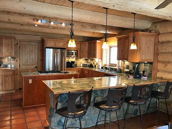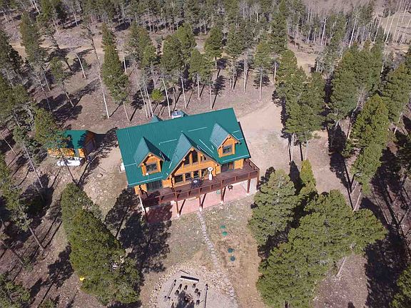 Magnificent Log Home! Custom crafted logs encompass this home, with large interior log beams supporting an impressive Cathedral ceiling in the Living Room, gourmet kitchen is open to a large formal dining area that supports fabulous entertainment of friends and family! Step out to the adjoining deck that stretches the entire length of this home that offers panoramic views of the east horizon towards Angel Fire Ski Mountain! Fabulous focal point is the massive Stone two-sided fireplace wall opposite the full picture window wall that welcomes you to the outside vistas. Two master suites, one being on main floor, bunk room that accommodates up to 10 children or grandchildren that adjoins a large TV/Game room and Kitchenette (Walk-out basement)! A must see if you love large family get togetherness and also makes for excellent rental income when not occupied by you!