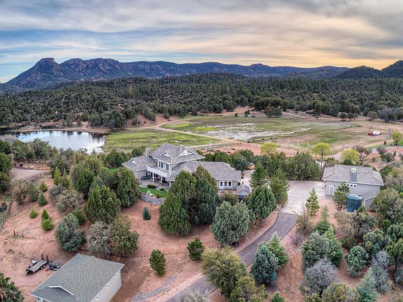 PRIVATE ESTATE BORDERING NATIONAL FOREST!This beautifully designed magnificent gated ESTATE resting on approximately 7 acres contains a 6000 square foot home with RV garages to accommodate your ''toys'', a heated & A/C shop, greenhouse, private ponds and breathtaking panoramic views of the Granite Dells, Monument Mountain, Diamond Point and The Rim. Relax in the four seasons room which opens completely to the outdoors with views of the beautiful Arizona sunsets. The main level hosts the master bedroom, heated bathroom floors and two other ensuite bedrooms. A beautiful staircase takes you to the upper-level game room with walk out decks, spectacular panoramic views and two ensuite bedrooms. Many trees surround the property and gazebo. Welcome home to this ''little piece of paradise''.
