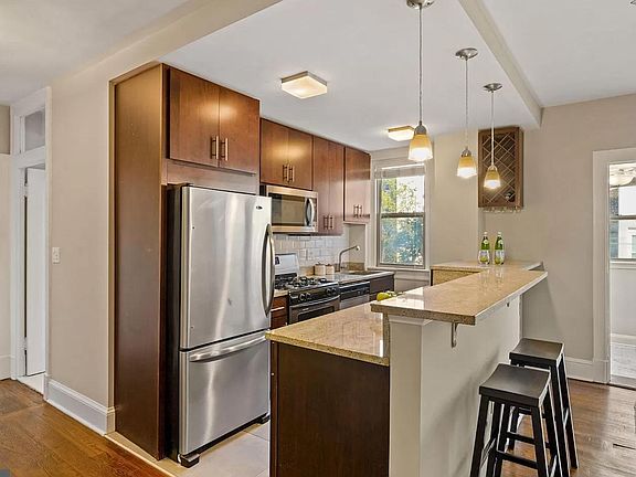 This condo on the top floor is awesome and checks every box on a renters list. It offers an open renovated kitchen with expansive breakfast bar, stainless appliances, wood cabinets and a ton of workspace. The kitchen opens onto the living room which is a good size and offers multiple options for entertaining. Nearby is the light-filled sunroom which could be a home office, a dining room, or even a space for guests. The bath is really nice and includes a soaking tub and high-end fixtures. The large bedroom can accommodate a king size bed. It includes two closets that make organizing two wardrobes easy. There is an in-unit washer and dryer for added convenience. Located in the heart of Kalorama and just steps to parks and Adams Morgan, you'll be just a short stroll to many of the city's most popular bars, restaurants, coffee shops and the Metro. You'll also be a few steps from the 42, 43, and L2 bus stops that take commuters downtown. This unit comes with a basement storage locker.
