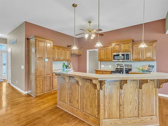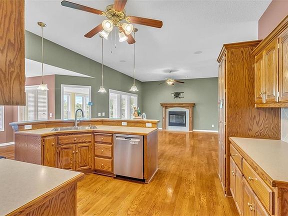 So many extras in this well-cared-for main floor living home.You back up to green space and trails which lead to Smithville Lake. Beautiful hradwood floors accent the open living rm, kitchen and dining rms which opens to your enclosed sunroom.A walk-in pantry in the kitchen with new dishwasher, sink and faucet. Newer carpet in bedrooms and tile bathrooms & laundry.Mstr bdrm features coffered ceiling & recessed lighting. Mstr bth offers dual sinks, separate shower and generous walk-in closet. The main level includes 2 bedroom, 2 full baths along with laundry, off the kitchen. 3 car garage with pull-down attic stairs for easy access and extra deep bay for your boat/toys. Plus you have a 4th storage/garage in the rear for mowers and workrm with built in work bench and shelves. A 3rd nice sized conforming bdrm and bthrm with shower is downstairs. The downstairs provides a recreational rm (they used it as an office) with built-in cabinets for TV/supplies, which walks out to a brick patio with in-ground steel firepit to enjoy your evenings. Dont miss the beautiful landscaping with Prairie Fire Flowering Crab, Redbud,River Birch,Weigela,Gold Flame Spirea,Holly,Boxwood,Azalias,Pigmy Bayberry,Miss Kim Lilac,Oak leaf/blue Hydrangea.Ivy,Vinca Minor,Roses,Purple Sage, Dianthus,Lilly of the valley,Cone Flower,Daisies,Black Eyed Susan,Iris,Hosta. Herbs for your kitchen are Mint,Chives,Basil,Dill,Sage. Plants are easy to maintain, for beauty and less work. You'll also have your Built-in gun safe (safe included) inside the locked closet. A storage rm in the lower level and a family/theater room (it's the one in the photos that's being painted) are adjacent to the office space and extra bedroom.There's also a covered patio for grilling with a convenient light above the grill spot and extra storage room off the patio. LL unfinished room painted, carpeted and door installed by 7/11.The downstairs provides a fmly rm (used as an office) with built-in cabinets for TV and supplies.