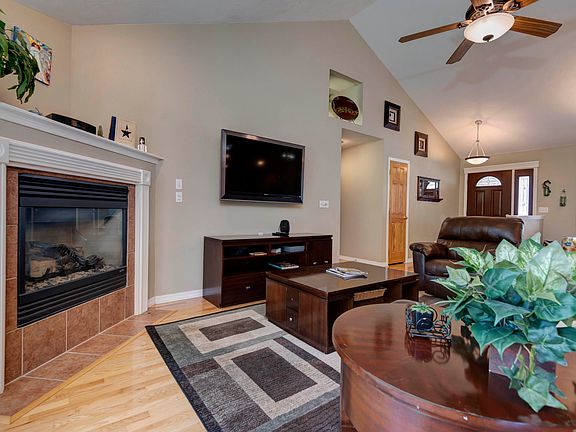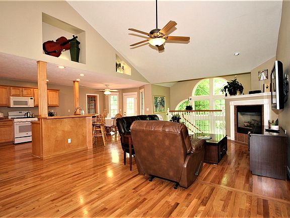 Stone Ridge! 3/4 brick walkout basement home that backs to woods! Located on a quiet back cul-de-sac. You'll love the charm of the front porch and the flat driveway for a pick-up game. Inside, it's today's favorite - an open floor plan! Hardwood floors in dining, living and kitchen, corner gas FP and a wall of dramatic windows brings the outdoors in. 3 bedrooms on the main floor includes the master suite. Laundry is here as well as a private family office. The lower level offers a large living room / rec-area space, 1 bedroom and a full bath, there's a John Deere / workshop room and a ''polar vortex'' storm shelter! Expansive deck area, fenced yard, and play area. Love the woods behind us! All appliances stay! Don't miss the neighborhood pool - perfect for summer.