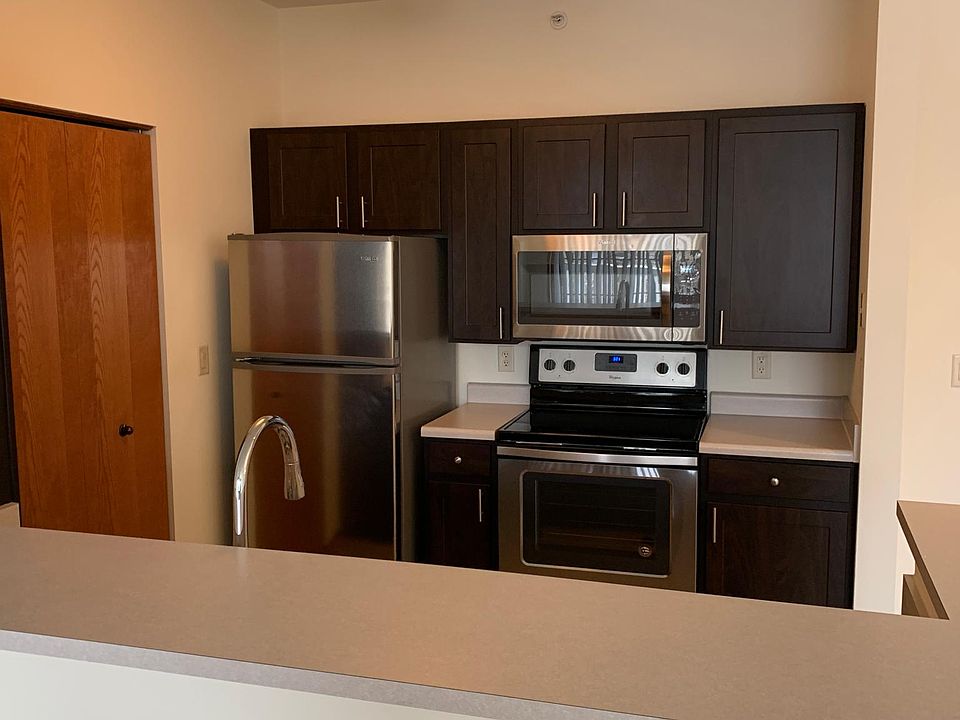 This is a top floor 1 bedroom + Den apartment with new stainless steel appliances and new wood plank flooring throughout the kitchen and bathrooms! The living room has brand new carpet and the den provides extra space with a large walk out balcony and french doors to close off with. The property features 24 hour access to a fitness center, a pool for the summer months, and a clubhouse available to rent for private events. The building features elevator access, key less entry, and underground heated parking.!! Tenant responsible for utilites which include an electric/gas bill with WE Energies and Water/Sewer/Trash Bill that is billed along with the rent