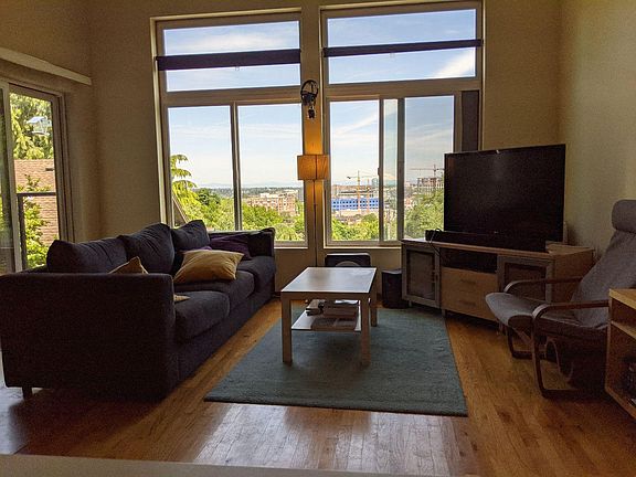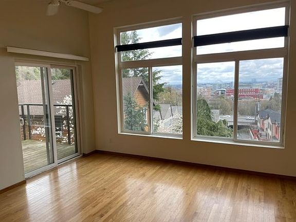 QUIET LUXURY CONDO on leafy cul-de-sac at the foot of scenic Portland Heights. Newly painted throughout! Unit looks better than new. Walk or bike to parks, trails, soccer games, 23rd Ave, PSU, OHSU, museums, etc. . Ideal top-floor corner unit in a modern, safe, video-protected security building. Very quiet unit has only one common wall and there is no unit above it. In addition to the unit's highly usable private view deck, there is a spacious communal roof deck with outdoor furnishings and panoramic city/mountain views. There are city/Mt. St. Helens views from unit's front room and private deck as well as from the tree-shaded rooftop communal area. Tall view windows and twelve foot ceilings flood the unit with vibrant and eye-friendly northern light. Unit comes with fridge, range, microwave, dishwasher and in-unit washer-drier. SOME INTERIOR PHOTOS were taken when the apartment was occupied. Apartment is currently vacant after professional painting throughout. PHOTOS OF MOUNTAIN AND CITY VIEWS were taken from the apartment. PHOTOS OF FOREST PARK, JAPANESE GARDEN AND TIMBERS SOCCER STADIUM were taken within a mile of the apartment. PHOTO OF 23RD AVE SHOPING AND DINING DISTRICT was taken within easy walking or biking distance of the apartment. THE BEST OF PORTLAND is yours to explore. WALK OR BIKE TO: Washington Park, Japanese Garden, 23rd Ave, the city's best shops and restaurants, Whole Foods, Timbers Stadium, Powell's Books, The Pearl, PSU, theaters and museums. CONVENIENCE: You are tucked away from congestion and traffic in a safe, secluded neighborhood, yet minutes from freeways and OHSU. MAX LINE is a five minute walk. FREE OF CHARGE: Two large storage areas including a capacious pad-locked walk-in adjacent to the secure garage area. FREE OF CHARGE: One designated on-premises parking space. PET FEE: $40 per month for cat or dog plus a $300 pet deposit. UTILITY CHARGE: $100 per month for water, sewer and garbage. Tenant is responsible for electricity and cable. One assigned on-premises PARKING SPACE is FREE. Two STORAGE AREAS are FREE. Renter pays $100 monthly charge for water, sewer and garbage. Renter pays $40 monthly fee for each pet. Renter pays for electricity and cable. Security deposit is the equivalent of the first month's rent ($1495). There is a $300 deposit per pet. Cat or small dog is welcome. Visitor parking is available on a limited first-come bases. Additional visitor parking is available on the street. This is a NO SMOKING BUILDING. Rent is month-to-month and due the first of every month. Unless you are pre-screened by ZILLOW, an application fee of $40 is required to cover credit and background check.