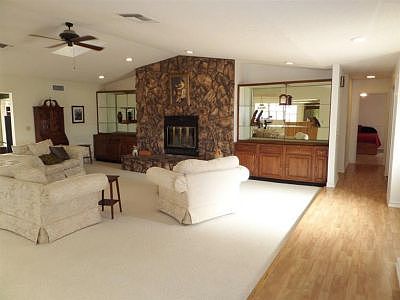 Country retreat great for entertaining!Sprawling lawns surround this unique home.Enter to Wilsonart floor in entry, hall,kitchen& dining.Enormous living rm is only carpeted rm w/fireplace flanked by bookshelves; skylites.'13 remodeled kitchen with granite counters & tile backsplash; ss appliances.Look thru to HUGE patio with fountain.Two guest bdrms w/tiled floors flank the library;full bath.East wing has large guest bedrm w/adjoining full bath; both have tiled floor.Mstr suite has wall of mirrored closet drs;tiled 3/4 bath;office retreat w/French doors to private area w/'05 spa!Walk property to discover open ended barn;private well w/new holding tank, red neckspa; several sitting areas located around perimeter of property,garden area,bridge,magnolia tree!!!Garage is extra long & has laundry area; opens to back patio.New windows installed 2001;well pump '04. Irrigation system '04 to water lawn; complete w/riding mower!Great home for entertaining large groups of happy people!