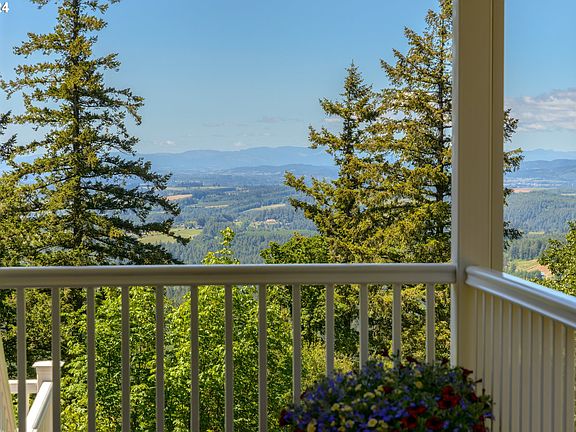 "The Summit at Finnigan Hill" is a hidden gem, where timeless elegance harmonizes with modern convenience. This beautiful traditional home is set on 6.21 acres of pristine landscaped grounds, offering stunning panoramic views of the coast range. The home features an expansive porch and deck, perfect for enjoying the breathtaking scenery, observing wildlife, and entertaining guests. Inside, the bright and flowing floorplan includes engineered hardwood floors and high ceilings, creating a spacious and inviting atmosphere. The well-appointed kitchen boasts Silestone counters, cheery breakfast nook, and stainless steel appliances including a smart fridge, smart dishwasher, built-in microwave, and range. The main level master suite boasts a walk-in closet and a luxurious bath with heated tile floors that conveniently connect to the laundry room. A second bedroom on the main level is located next to a full bathroom, ideal for guests or family members. Upstairs, an open family room (pool table included!) provides a great space for entertainment and relaxation. The closet in this room is perfect for storing games. Additionally, there is an exercise room and a media room with soundproofing in the walls and floor, scene lighting, a 106-inch screen, low voltage panel, and a wet bar for enjoying movie nights in style. Two more bedrooms upstairs share a full bath off the hall. A spacious garage completes the home with two 240v outlets which come in handy for electric vehicles. The exterior of the home features a pristine balance of grassy lawn and mature trees, providing both beauty and privacy. A peaceful retreat next to two wineries and yet centrally located to commuter routes, the hi-tech corridor, and minutes from the heart of Newberg. Don't miss the opportunity to own this exquisite property with unparalleled views and exceptional features. Contact us today to schedule a private showing and experience the beauty and elegance of this stunning home for yourself!