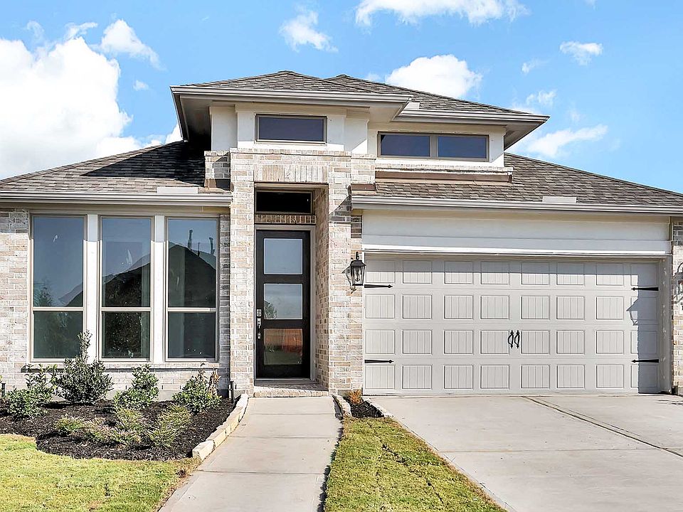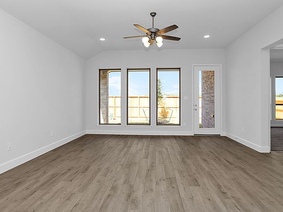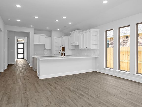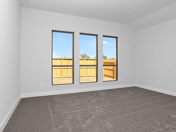 Extended entry with 12-foot ceiling leads to open kitchen, dining area and family room with 10-foot ceilings throughout. Kitchen features center island with built-in seating. Family room features wall of windows. Primary suite with 10-foot ceiling and wall of windows. Dual vanities, garden tub, separate glass-enclosed shower and large walk-in closet in primary bath. A guest suite with private bath adds to this four-bedroom home. Covered backyard patio. Mud room off two-car garage. Representative Images. Features and specifications may vary by community.