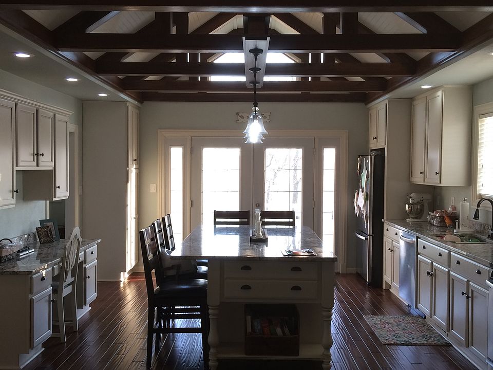 Custom home with high-end remodel features such as vaulted ceilings with curved beams, custom built-ins and a private gym on the property.