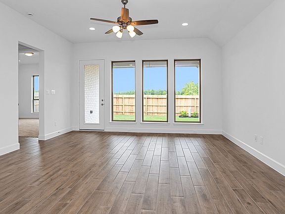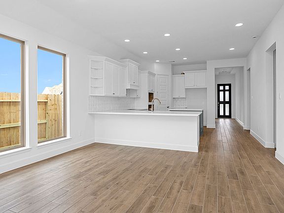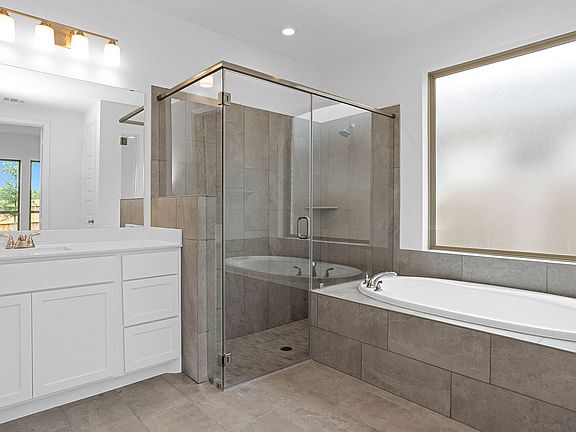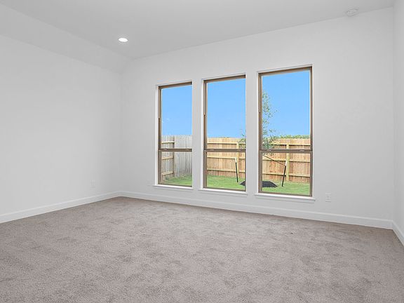 Home office with French doors set at entry with 11-foot ceiling. Open kitchen offers center island, 5-burner gas cooktop and corner walk-in pantry. Dining area opens to spacious family room with wall of windows. Private primary suite includes bedroom with wall of windows. Dual vanity, corner garden tub, separate glass-enclosed shower and large walk-in closet in primary bath. Abundant closet space and natural light throughout. Covered backyard patio. Mud room off two-car garage. Representative Images. Features and specifications may vary by community.