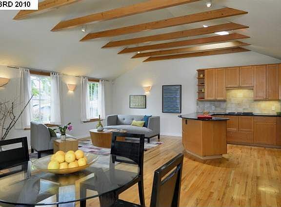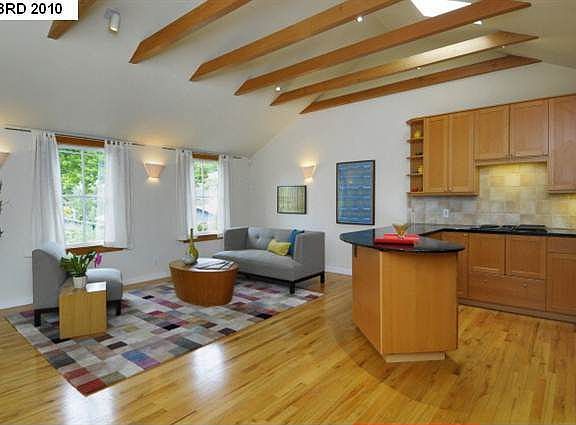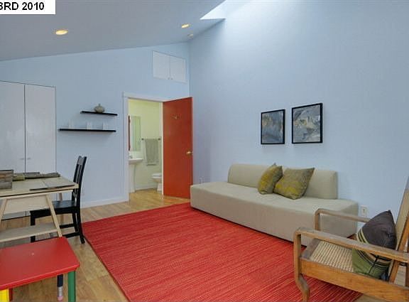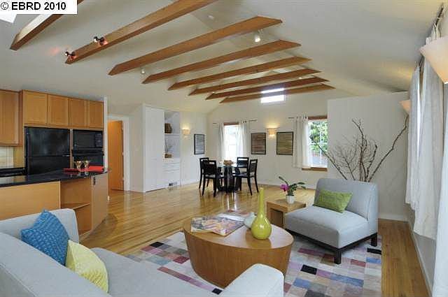 Dramatic architect-designed condo! \"Great room\" plan with high cathedral ceilings. Two bedrooms, one bath in second floor unit plus additional exterior-access ground floor \"studio\" room with full bath. First-rate recent construction. Close to 4th St. shopping and S.F. bus. Don\'t miss!