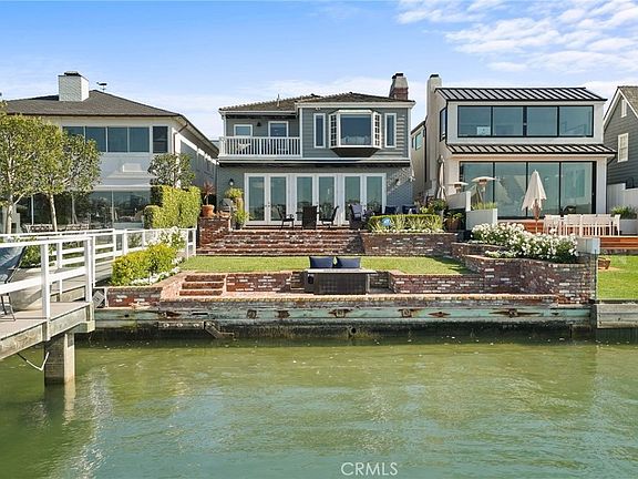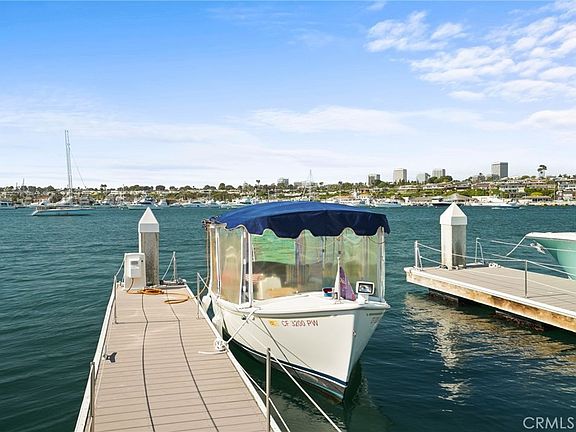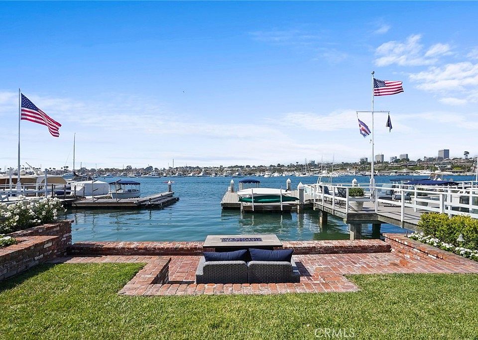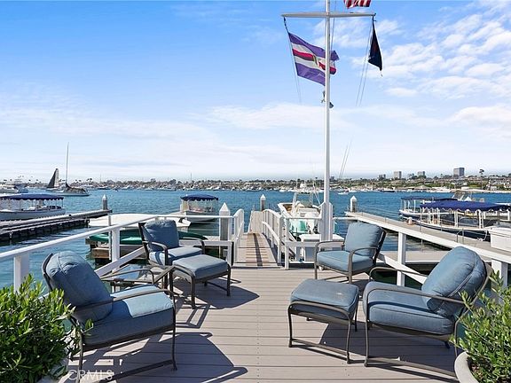 Craftsmanship & elegance radiate from this immaculate abode overlooking the blue waters of Newport Marina Harbor. From warm, planked flooring to sophisticated millwork, the 4 BR/5BA embellished interior is tastefully executed. The chef's kitchen, boasting high-end stainless steel appliances, drops down into a living room/dining room where floor-to-ceiling glass doors reach up to coffered ceilings & stately fireplace warms you on chilled evenings. Blur the lines between indoor & out as salty air drifts in from the patio, landscaped lawn, & private dock. Dock can hold a 40+ vessel and side-tie for your Duffy. Gather around the outdoor fireplace & relish in laid-back California living. This home sits on a 35 ft. wide lot offering an expansive yard including brick deck & large grassy area for kids and pets to play. Inside, a family room provides a wet bar & access to the garage and a full bath. Cherish waterfront views from the primary suite's private balcony while a fireplace & spa-like ensuite offers ultimate rest & relaxation. This timeless residence includes all furnishings, Duffy boat, golf cart & access to all of Newport Beach's finest locations.