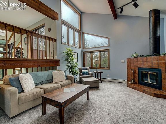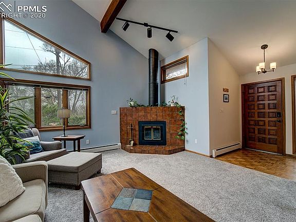 One of a kind custom home that features 2 wood burning fireplaces. Main level has the living room with fire place, half bath and laundry. Up a level is the master suite with a sitting area, fireplace, walk in closet and private bath. The next level has your dining room with a walk out deck and large kitchen with plenty of counter space and cabinets, canned lighting, stainless steel appliances and granite counter tops. The top level has an additional full bath and 2 bedrooms with mountain views from one bedroom. One of the bedrooms is being used as a office and has a beautiful view of Pikes Peak. Lower lever has the family room with a unique sun room that walks out to the back yard. Basement has been finished to include another bedroom and bath. Home has a new evaporated cooler installed for those warm summer nights. As you enter this beautiful home you will notice all the natural light from the windows.