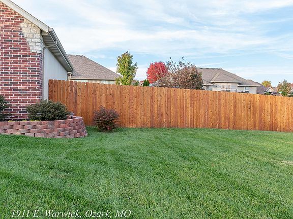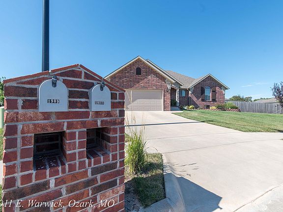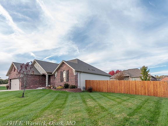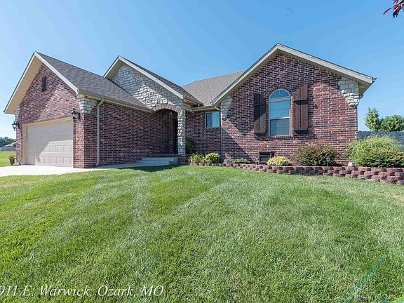 1911 E Warwick, Ozark, MO 65721. $5000.00 Price Reduction!! Buyer received upsetting health diagnosis...so it's your turn to snap up this great custom-built home on a cul-de-sac in Grand Haven! Great access to Hwys 65 & 60 just minutes away! Brick and stone front and gables create a great curb appeal. Immaculate, move-in ready home features open floor plan, solid surface floors, carpet in living room and bedrooms, tiled walk-in shower, jetted tub, surround sound in living room and master bedroom, gas fireplace, easy close drawers and doors, large kitchen pantry, earth tones throughout, and security system. Lovely outdoor living with stamped concrete patio, landscaping with concrete edging, garden area, and large side yard. Swing and landscape lights stay with home.Subdivision offers swimming pool,clubhouse,basketball goal, and children's play area. Close to shopping, restaurants and schools.