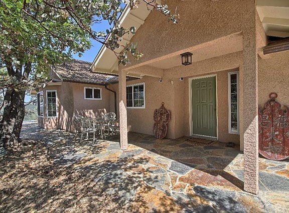 Private retreat adjacent to Sierra National Forest with amazing sunset views, good well with large storage tank, and a beautiful 4 bedroom 3 bath home. The 2168 square feet of open living space features vaulted ceilings, numerous windows providing natural light, plus a 12' x 20' enclosed patio. Kitchen features include granite counters, quality, stainless steel appliances, double oven, and a single basin oversized stainless steel sink. Mariposa slate patios wrap around the home creating entertaining spots and gorgeous views in every direction. Enjoy the outdoor spa and above-ground pool with deck! Much thought and many upgrades went into building this home, including copper gutters, an outdoor shower, security alarm and camera system, wired-in sound, 3 car garage with workshop, outbuilding for storage, and covered firewood storage. Situated on 98 acres, the land has been partially brushed and left partly in a natural forest setting, and may be split into two 40+ acre parcels. Driving trails, two spots to develop ponds, & huge granite outcroppings make for fun hiking & exploring opportunities. This fabulous property is located off State Hwy 49 just 20 minutes from either Oakhurst or Mariposa; Yosemite Nat'l Park is an easy drive in either direction.