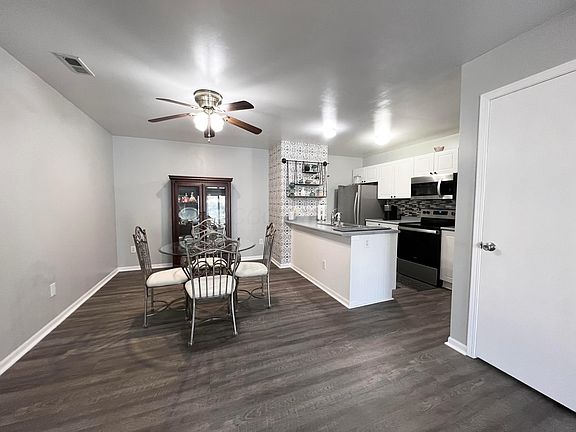 Newer stainless steel appliancesStylish backsplashMiracle method countertopsDedicated guest parking padCozy corner gas fireplaceFenced patioWall of closet space