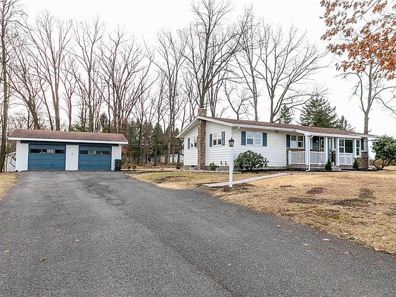 This home is move-in ready. Owner put much thought and pride into this recently updated ranch home. Almost everything is brand new: windows, flooring, kitchen appliances, counters, & roof. There is a central hall foyer that opens into a large living room or living room/dining room combo (whatever the buyer prefers). This is on the south, west, and north side of the home which makes it bright & great for plants. It also showcases beautiful sunsets. The owner remodeled the home from a 3 bedroom, 1 bath home to a 2-bedroom, 2 full bath home. The basement is 85% finished w/ new carpeting. There is plenty of closet and storage space in the unfinished area, which includes the oil boiler room & old coal room. There is a bilco door and a room for the well holding tank. Outside is a covered 16x7 front porch,15x8 covered back patio, & a 12x20 patio. Bonus is the oversized 2 car & 1 car garage/garden shed. Both have electric. Corner 1.63 acre partially wooded lot has open farmland views.
