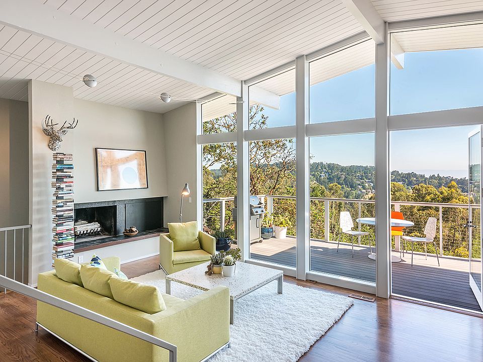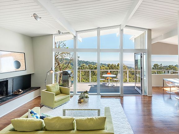 The elegant restraint of modernism is evident in this confirmed Tom Lowe designed mid century home. Clean lines, soaring ceilings, mesmerizing three-bridge views. Chef's kitchen with such high end appliances as Viking gas stove, Miele dishwasher, Fisher Paykel refrigerator. Real oak floors, wood burning fireplace, upgraded bathrooms. Spacious, just over 2000 sq ft 3+BD/2BA home, there is even space for an at-home gym, a dedicated lady's dressing room, an entire laundry room. The OPEN FLOOR PLAN is conducive to convivial evenings with friends, the two decks provide excellent indoor/outdoor flow. In superb MOVE IN condition, the home has a two year old roof still under warranty, a four year old furnace, central air conditioning, solar panels, and is sewer lateral compliant. Near biking and hiking trails, the air is fresh, the ambiance serene.