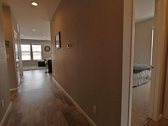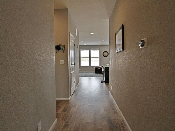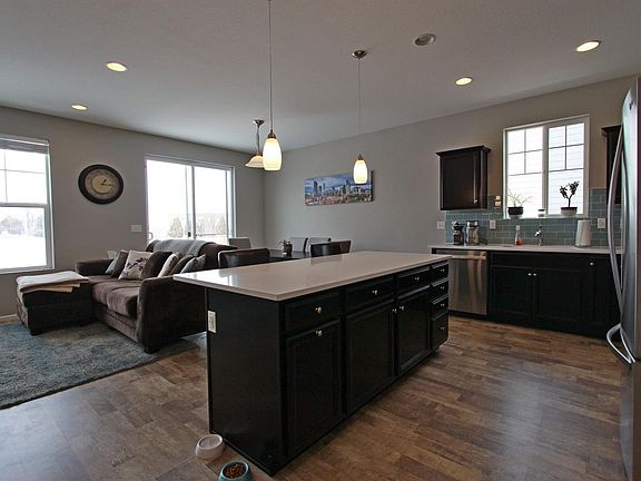 Lovely Ranch style home in newly completed neighborhood with fully landscaped yard and large unfinished basement. Beautiful quartz countertops and glass tiles in open floor plan kitchen. Sliding glass door includes a high quality "doggie door." The original glass is available and can be replaced upon buyer's request. Dryer uses gas and is included along with fridge and washer with the property.