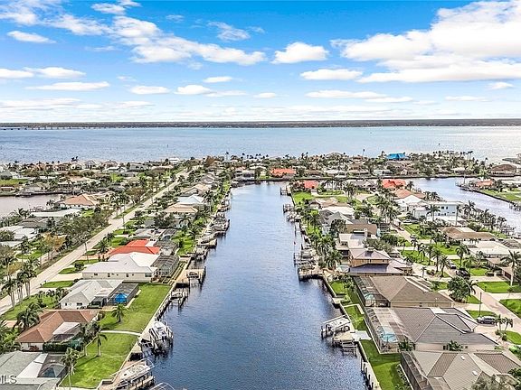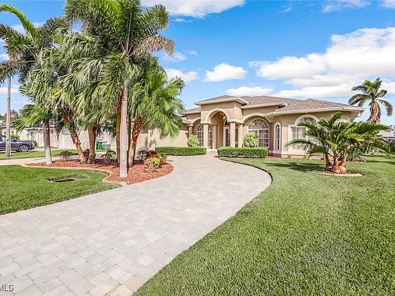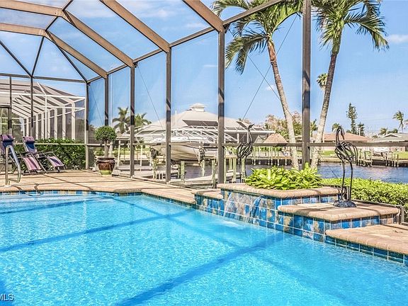 METICULOUSLY maintained original one owner Tracey Homes custom built 4 beds/3 bath dream home can now be yours in the most desired SE Cape Coral area PALACO GRANDE with its UNRESTRICTED DIRECT sailboat Gulf of Mexico waterfront access. Minutes to open waters! NEW ROOF in 2022 and newest A/C 2021. Property is surrounded with like upscale waterfront properties. Huge GREAT ROOM with fireplace has open floor plan to the oversized lanai and pool area, overlooking the panoramic and breathtaking water views and almost 200' canal. Relax and live the dream with friends and family! Beautiful wood cabinets, granite countertops and island with cooktop in kitchen along with breakfast bar along with convenient double oven and pantry. Large beveled glass at breakfast nook revealing unrestricted views to pool area and waterfront. Formal dining room with upgraded chandelier. Upgraded faucet, fans and lighting fixtures throughout. Custom crown molding accents the living areas and Primary suite. Large paver lanai and oversized Pool deck ideal for entertaining and the island sounds of your sheer descent waterfall. A guest bath conveniently designed to double as pool bath. Lush landscaping and floritam sod with custom designed paver walk-way around the perimeter, including pave circular drive! No intrusion in this Florida oasis ever! Virtual video link of property is a must see along with a video of the City. TRANSFERABLE FLOOD INSURANCE POLICY with $1,739/year PREMIUM through June 11, 2026!! NO MANDATORY HOA FEE!!