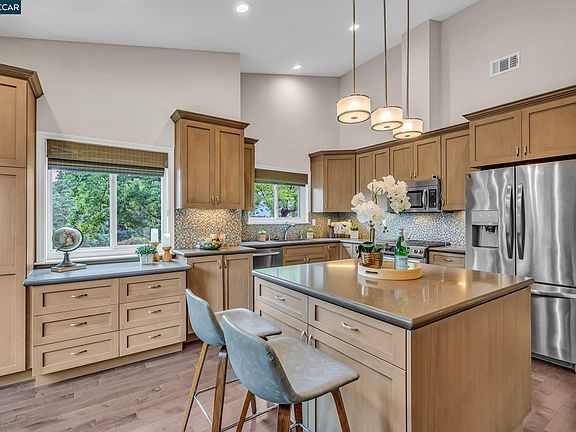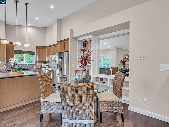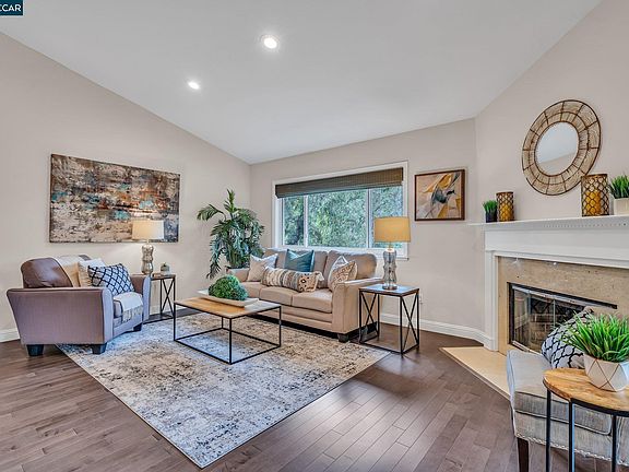 Rare end unit townhome nestled in Falcon Pointe of Pleasant Hill. The bright and airy main living area boasts vaulted ceilings and warm laminate flooring. The living room has an inviting fireplace and opens to the beautifully remodeled kitchen that features modern shaker-style cabinets, a gas range, stainless steel appliances, a center island, and a balcony with wooded views. Upstairs you'll find the private primary bedroom suite complete with an ensuite bath featuring dual sinks and a tub/shower. On the lower level are two additional bedrooms both with mirrored closet doors - one offering direct access to your own outdoor space. Enjoy easy living in this desirable location close to Paso Nogal Park, highly rated K-12 schools + Diablo Valley College & plenty of shopping just minutes away!