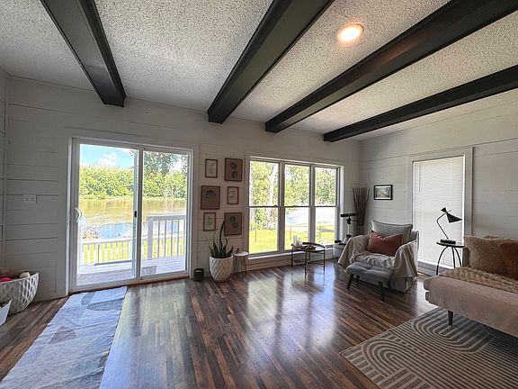 Dream of living on the River? Beautiful views from this recently updated 3 bedroom home! Major updates since 2020 include roof, brand new roof on the large garage (23), vinyl and wood siding, new gutters with guards (23) some windows, flooring, electric, bathrooms, plumbing and rear deck. Kitchen has plenty of cupboard space and is painted in the blue and white updated theme. New tile backsplash, hood and dishwasher! The show stopper is the very spacious 27x 19 living room with access to the deck and patio areas and plenty of windows. Main floor master with full bathroom. Upstairs there is sizable bunk room that will accommodate several beds. Back yard is partially fenced. Large city lot. 2 garages 20x18 and 36x24. Public boat launch less than a block away! Partial flood zone does not include the dwelling. Seller will need some time to find home of choice!