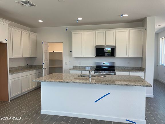 Tree-lined streets, pedestrian-friendly sidewalks and a 5,500 sf recreation center with resort style pool an kiddie pool, shaded ramadas, parks, gathering areas, pickelball courts and basketball. Close to I-10, 101 and 303. Walking distance to restaurants, movies, entertainment and shopping. 4-panel sliding glass door from great room to covered patio. 4-foot gate at front and rear of sideyard. Front yard landscaping includes turf. Gas stub at sideyard. Pavered entryway. Modified primary bathroom, includes walk-in shower with clear glass enclosure and cultured marble surrounds. Stainless steel appliances at kitchen including dishwasher, microwave, and gas range. Cabinets are shaker style painted white, with extra features including a pull out trash, boxed-in refrigerator.