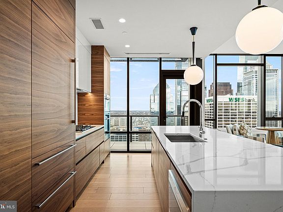 A Day Above It All — Sky Residence 3804 at The Laurel Rittenhouse Perched high above Philadelphia’s skyline, Residence 3804—the highest two-bedroom home in The Laurel Rittenhouse—redefines elevated city living. As you step into this Sky Residence 4, you immediately sense the quiet luxury of design that transcends trends. Every surface has been thoughtfully curated, beginning with walls wrapped in warm oak decorative slat panels, seamlessly concealing doors and closets, creating a continuous flow of texture and refinement. Morning light floods through floor-to-ceiling windows on the northeast corner, revealing panoramic city views that stretch from Rittenhouse Square to the Delaware River. The open living and dining area, framed by over 10-foot ceilings and Carlisle Wide Plank blonde hardwood floors, is anchored by a striking ventless gas fireplace, elegantly set within the same oak paneling that defines the home’s architectural rhythm. In the heart of this residence lies a gourmet kitchen worthy of its skyline backdrop. Outfitted with Hans Krug two-toned cabinetry—a sophisticated mix of matte walnut and high-gloss white—it’s both a showpiece and a chef’s dream. The Calacatta Quartz waterfall island invites casual gatherings, while the integrated Sub-Zero refrigerator, Wolf gas cooktop, steam and convection ovens, and Signature dishwasher ensure performance matches style. A wet bar with a full-size Sub-Zero wine fridge and beverage center completes the space, perfect for evenings that begin with a toast on the first of two private balconies. The primary suite is an intimate retreat, where the second balcony offers tranquil views of Rittenhouse Square. Custom wallpaper and fully automated blackout drapery frame a setting of quiet indulgence. The primary bath features floor-to-ceiling porcelain walls, marble floors, and an expansive shower adorned with Fantini fixtures—a sanctuary of calm and craftsmanship. A custom-designed walk-in closet provides both beauty and order. Even functional spaces have been elevated: the laundry room features a full-size, vented Maytag washer and dryer with bespoke cabinetry, reflecting the home’s holistic attention to detail. Technology and design converge effortlessly throughout the residence. Lutron Palladiom keypads, Leon built-in speakers, Lutron shades, Forbes & Lomax Invisible Light Switches, and a powerful Araknis Wi-Fi network bring both intelligence and subtlety to daily living. Every day in Sky Residence 3804 begins and ends with the city at your feet—the energy of Philadelphia shimmering below, and the quiet sophistication of The Laurel Rittenhouse embracing you in the clouds. This is not just a home; it’s a private sanctuary in the sky, reserved for the few who seek the pinnacle of Rittenhouse luxury. ***One parking space is included in listed price, second parking space is available for additional $100,000***
