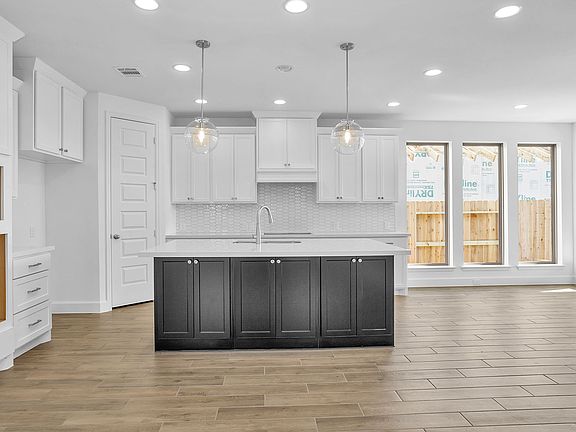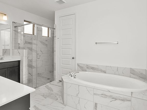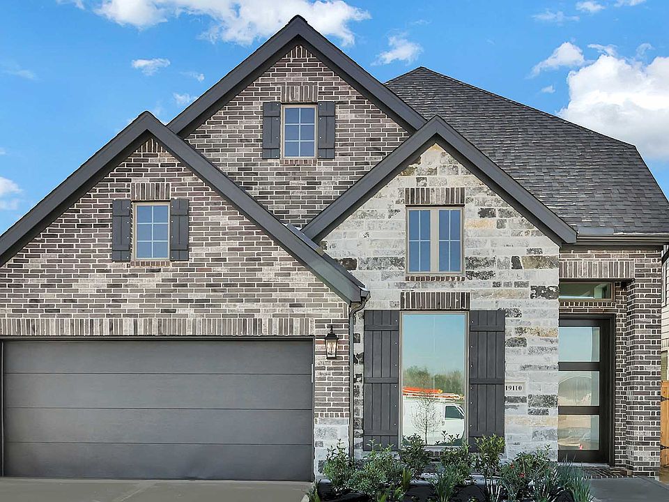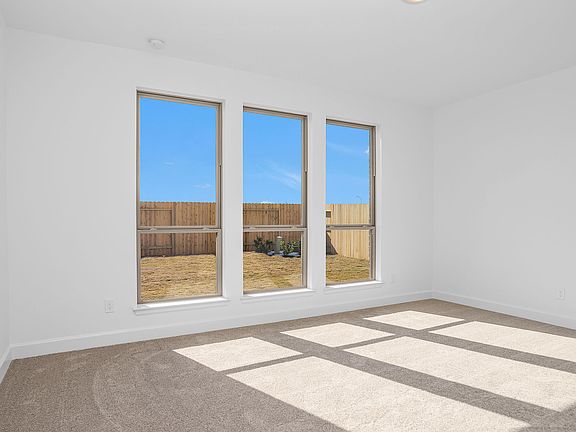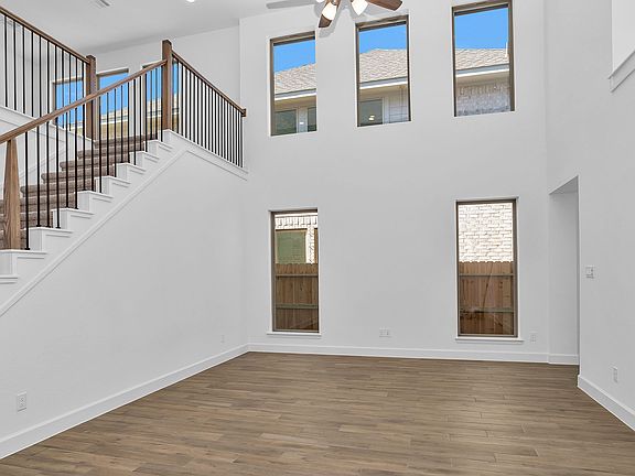 Welcoming front entry lined with three large windows. Home office with French doors off the entry. Inviting family room with 19-foot ceilings flows into the kitchen. Island kitchen with built-in seating and a corner pantry opens into the dining area. Private primary suite features three large windows and access to the utility room. The primary bathroom has dual vanities, a garden tub, a large separate glass enclosed shower, a linen closet, and two walk-in closets. Upstairs includes a game room, secondary bedrooms with a Hollywood bathroom, and a guest suite. Extended covered backyard patio. Mud room just off of two-car garage. Representative Images. Features and specifications may vary by community.