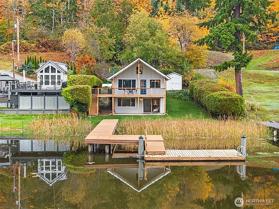 Escape to the Sunnyside of Big Lake with 60 ft of shoreline and a turn-key cabin ready for relaxation. Make lasting memories with all-day sunshine on this crystal-blue lake. Enjoy a beautiful dock for multiple boats. This large lot allows space to add a 3-car shop with a guest house above. After a day of swimming and boating, unwind on the spacious deck offering breathtaking sunsets with expansive lake and mountain views. Inside, the lower level is ideal for a game room where you can step out to the covered patio and lush, sprawling lawn. Enjoy vaulted ceilings, hardwood floors, loft, and walls of windows that invite the outdoors in. Just 8 min to amenities, 3 min to the golf course, 90 min to Seattle -your ideal lake getaway awaits!
