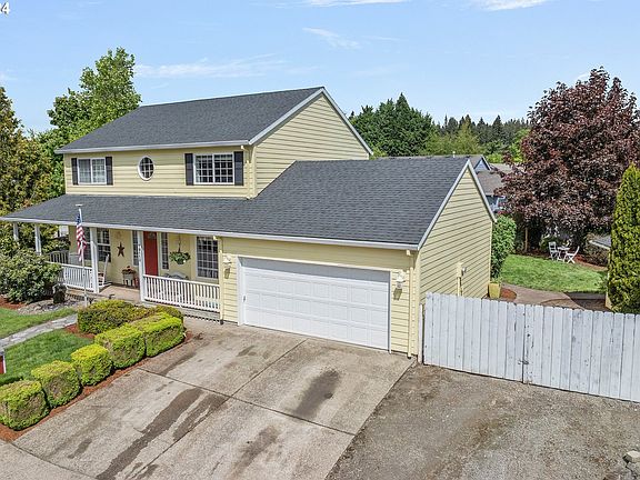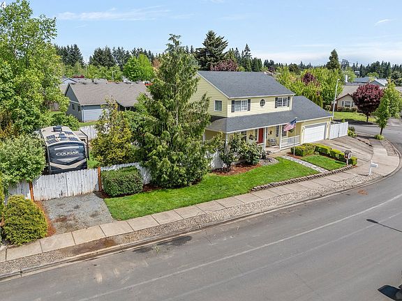 Welcome to this beautiful farmhouse in the highly desirable Thayer Estates neighborhood! This stunning two-story home combines classic charm and convenience. Situated near shopping centers and major freeways, this location offers both tranquility and easy access to everything you need. As you enter, you'll be greeted by newer LVP waterproof flooring throughout the main level, offering durability and style. The spacious living room features a cozy gas fireplace, ideal for relaxing evenings, while the formal dining room is perfect for hosting dinner parties. The second level has been thoughtfully updated with new carpeting, fresh flooring, and a beautifully renovated bathroom. The large primary bedroom suite boasts a double-sink vanity, two walk-in closets, and a walk in shower. Outside, the home continues to impress. A charming wrap-around porch and very large covered patio invites you to enjoy morning coffee or relaxing in the hammock. There's plenty of space for your recreational vehicles with a 35-foot gravel RV parking pad, an additional area for a boat or smaller RV, and a 10x11 insulated shed with power and AC for your projects or extra storage. Nature lovers will appreciate the property's apple, pear, blueberry, and raspberry plants, providing fresh produce right in your backyard. With a newer roof, water heater, and ample storage above the garage this home is ready for you to move in and start enjoying all it has to offer. Don't miss this opportunity to own a piece of paradise in one of the area's most sought-after neighborhoods. Schedule a showing today!