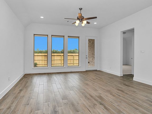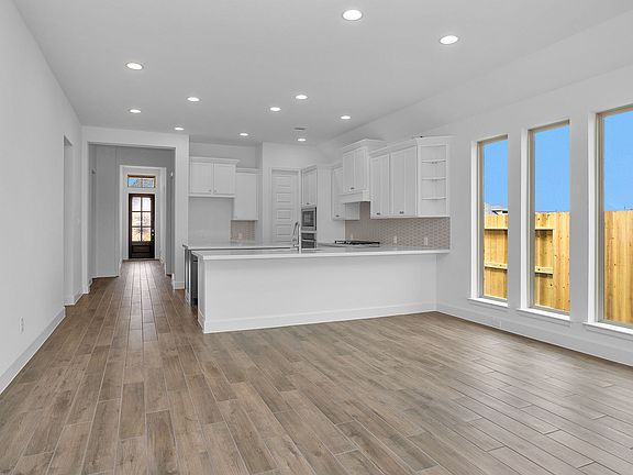 Extended entry with 12-foot ceiling leads to open kitchen, dining area and family room with 10-foot ceilings throughout. Kitchen features center island with built-in seating. Family room features wall of windows. Primary suite with 10-foot ceiling and wall of windows. Dual vanities, garden tub, separate glass-enclosed shower and large walk-in closet in primary bath. A guest suite with private bath adds to this four-bedroom home. Covered backyard patio. Mud room off two-car garage. Representative Images. Features and specifications may vary by community.