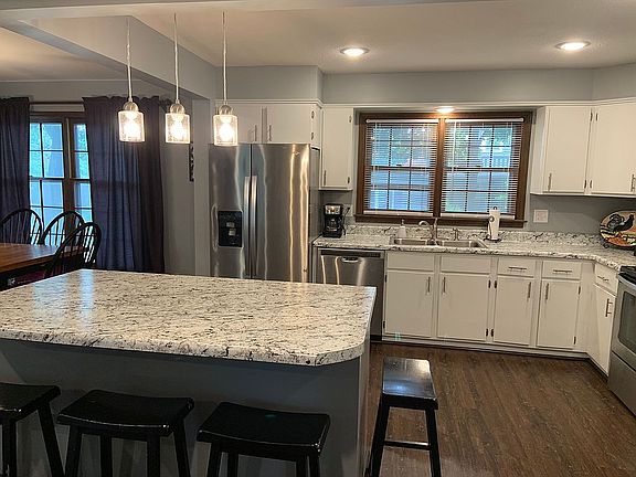 Charming 2 story home w/ limestone accents in great central location within walking distance of Kansas State University, Lee Elementary & Manhattan High School. Nestled in wooded bliss this lovely home has been updated w/ mn level & kitchen remodel in 2018. New roof & gutters. Impact Resistant shingles. Upgraded laminate wood floors on mn level. Open kitchen w/ island, built-in pantry, new countertops, SS appliances, lighting, fixtures. Eating area is also open to main level FR w/ access to screened deck through French doors. LR is elegant w/ beautiful dramatic bay window w/ window seat, floor-to-ceiling brick FP & access to dbl garage. Upper level features MBR w/ bath, WI closet & access to private upper level deck, 2 BRs, & full bath. Full fin bsmt is complete w/ Family/rec room, wet bar, area for desk w/ built-in bookcase, BR w/ egress & built-in shelving, BA w/ laundry & storage. Wooded lot w/ stream & bridge to play area & firepit. Sec System, sprinkler system(as is)