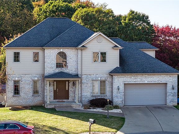 Beautiful & Tranquil 4 BR, 3.5 Baths custom built with wooded views and hear the creek waterfalls while relaxing on the large Trex deck or sunbathing with your own new pool--all on a prime cul-de-sac. Inviting covered porch, brick/vinyl siding; concrete driveway. Storage is unbelievable; wait until you see the heated bonus room off vaulted Master BR with ensuite bath. Spacious bedrooms w/new carpeting. Enjoy a large Eat-In Kitchen with granite CT’s, SS appliances, extra bar sink in island, pantry. Handsome hardwood floors through out main level. Den with built-in bookshelves & glass door. 2,702 sf + add’l 1000+ sf of finished walk-out basement with huge wet bar & granite CT; another BR can be used for in-law suite. Large shed; patio. 2 gas Fireplaces. Multi-dimensional shingles. No HOA fees. 10 min to Cranberry Twp.