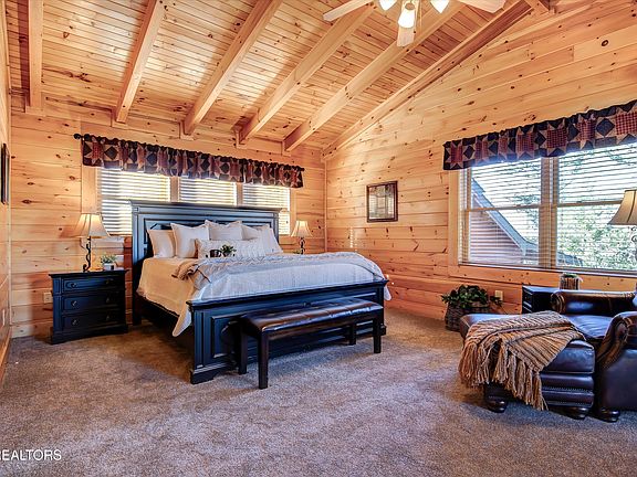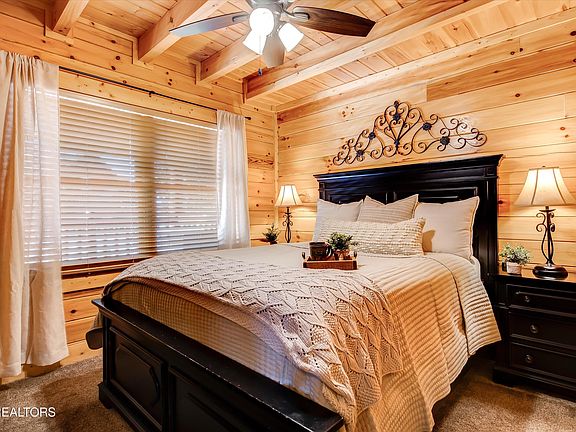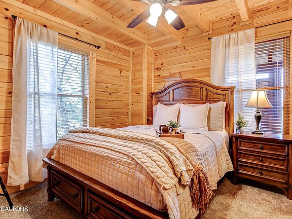 Fabulous cabin with over 200 top ratings on VRBO and Airbnb!! You'll love this charming 3 BEDROOM 2 BATH LOG CABIN WITH SERENE VIEWS OF ROLLING SMOKY MOUNTAIN HILLS AND MEADOWS, just minutes from downtown Pigeon Forge. The cabin is perfectly situated in one of the prime locations within the desirable Covered Bridge Resort—at the end of a tranquil cul-de-sac, offering ample level parking for your convenience. Upon entering, you're greeted by a bright and open living space featuring gleaming hardwood floors, cozy stone fireplace and a kitchen equipped with stainless steel appliances. Step out the back door to relax in rocking chairs or soak in the hot tub while enjoying the picturesque view. The first level includes 2 bedrooms with beautiful exposed beams and a shared bathroom. Upstairs, you'll find a spacious KING SIZE MASTER SUITE with stunning cathedral ceilings, a jetted tub, and a private bathroom, along with an AIRY LOFT that features games and a TV sitting area. Located at the end of a cul-de-sac, the cabin offers convenient level parking. Enjoy close proximity to Pigeon Forge, Dollywood, and all the local attractions without navigating steep mountain roads—easy access with public utilities and high speed internet. The current owners cherish making family memories in their mountain home and have kept it well-maintained.