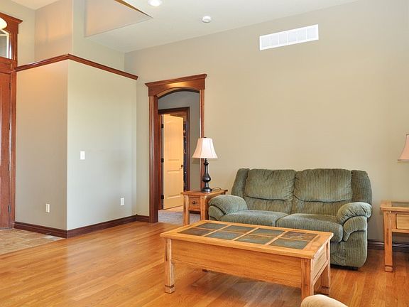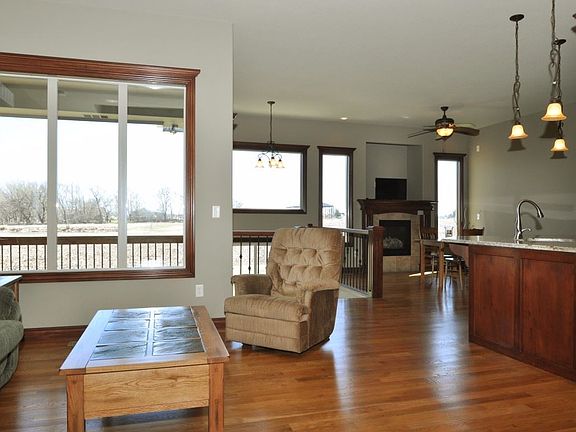 Former Sand Creek Station model home. Tall 10 ceilings with a gas fireplace, numerous east facing windows with an open concept throughout providing terrific views and a spacious grand feeling. Features include master bath w/split vanity, marble counter tops, soaker tub, separate shower, tray ceiling, accent lighting, and a walk in 3 season closet. Granite counter tops in kitchen, guest baths, and the wet bar. The back entry hall mud/laundry room has a built in bench and sink. A newly refinished east facing elevated walk-out covered deck provides great morning sunrise views with cooler afternoon sitting: overlooking the backyard, neighboring farm field, and the amazing scenic views of two ponds. The partially finished basement features a bathroom, wet bar, and family/rec room for entertaining. The unfinished part of the basement provides the framing for two more bedrooms (with windows) and many options to easily make "storage rooms into multimedia, exercise, second laundry, or your specific custom use rooms to quickly add over 500sqft of finished space! A mid-level walkout from the basement provides easy access to the large backyard, covered patio, and an open concrete patio perfect for spending time with friends and family. The professional landscaping includes a complete irrigation system, private well, HOA compliant design, and 1 year warranty from contractor. Located across from the 14th green, you are an easy walk from the club house, swimming pool, basketball court, and a walking/running/biking trail. Plus, only a short distance from restaurants, grocery store, shopping, banking, medical/dental clinics, hospital, pharmacies, and churches. Easy access to Hwy 50 and I-135 for a short commute to any nearby city!