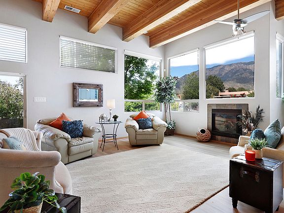 Stunning views to entice you on this one level Sandia Heights beauty. New Luxury Vinyl Plank flooring and brand new carpet. Superb, light & bright & open floor plan. Soaring ceilings and some T& G ceilings only add to the custom touches. Large open kitchen with seating bar, breakfast nook and tons of custom cabinetry & pantry. 3 gas log fireplaces to keep you warm and cozy. Steam shower in master bath. Outside, enjoy amazing roof top deck, firepit, water feature and again I have to say it, VIEWS. Just around the corner from O'Beans Coffee or the Tramway trails. You are not going to want to miss showing this one of a kind place. Seller to review offers on Saturday 5/27 by 3:00 PM. Seller does reserve the right to accept an offer earlier.