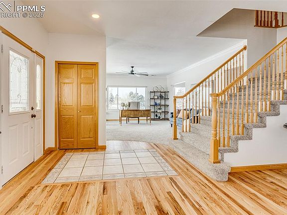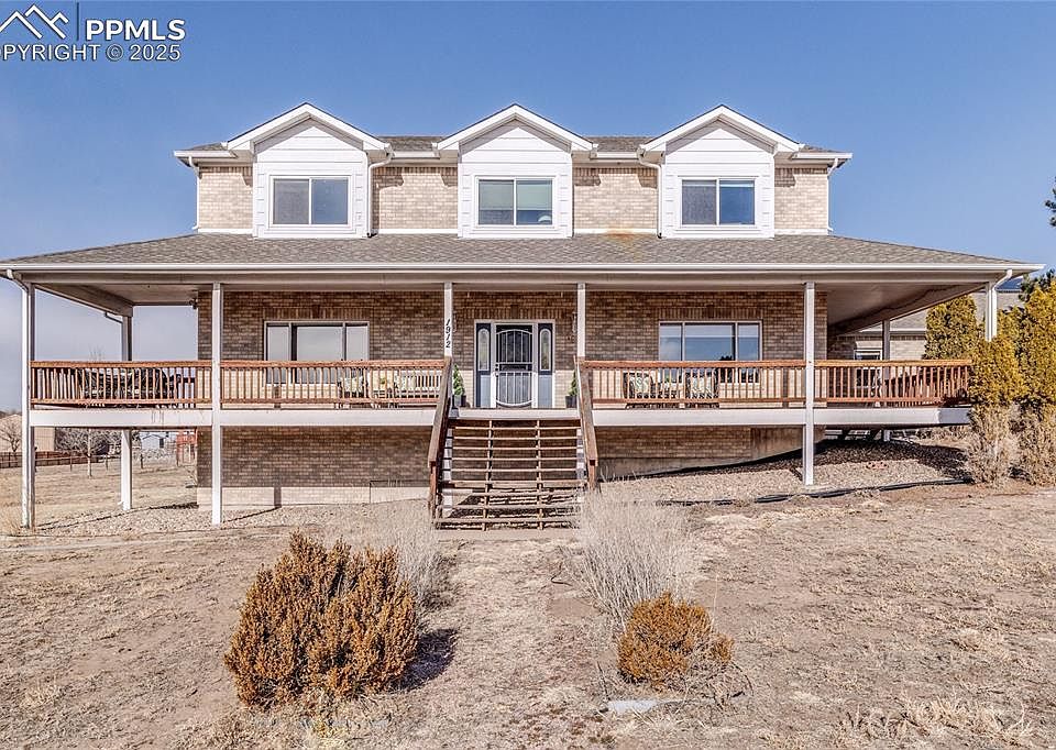 Rare opportunity to live in this sought after neighborhood, Falcon Estates. Bring your outdoor toys to this two-story brick home that is situated on a one acre lot that is in move in condition. This beautiful two-story home has 5 bedrooms 3.5 bathrooms, a huge 6 car tandem garage with amazing mountain views in the award winning school District 20, convenient location in the middle of town. New hot water heat for heating and A/C for your summer comfort along with an attic fan. Enjoy sitting out on your wrap around porch drinking looking at the front range. Great entertaining home with plenty of space for your guest and all of the rooms are very large. Main level there is a family room with wood floors that opens up to the gourmet kitchen that any chef would appreciate, large kitchen with stainless steel appliances including a Thermador oven. Lots of seating areas at the counters in the kitchen, additional seating in the breakfast area and a large formal dining room right off of the kitchen. Additionally on the main floor there is a very large formal living/office that is carpeted with amazing views of the front range from every window. New carpet throughout the home and the wood floors on the main floor were just refinished. Upstairs there are 3 bedrooms that all have walk-in closets, fabulous views from all bedrooms. Primary bedroom is extremely large with vaulted ceilings, a sitting area and its own private bathroom with a large soaking tub, stand-up shower and a double vanity. You will not mind doing laundry in this oversized room that is close to all of the bedrooms that can double as a craft or hobby area. In the basement is a huge family room that has enough space to make a game room in addition to a television/movie area. There are two additional large bedrooms in the basement with a bathroom that has a stackable washer/dryer for easy convenience. There is a dog run in the backyard that has access to the shed for shelter for your pet. This home is a must see!