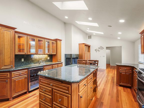 One level home on Springhill Golf Course. Remodeled interior- kitchen w/dual dishwashers, granite counters, skylights & fireplace. Primary suite w/built-in drawers & safe in the closet. Primary bath w/heated floors & a walk-in shower w/two fold up chairs. Laundry rm w/sink, granite & custom cabinets. Lg driveway w/mature landscaping. Built in Central Vac, extra wide hallways & doors, wheelchair friendly design. Fully fenced yard w/2 sheds. Room for RV. Lg, covered patio w/views of the golf course!