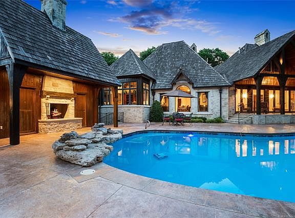 Featuring curated finishes & a one of a kind entertainment room. Rustic elegance is on full display in the home, which affords 5-bed suites, home theater, in-home exercise facility, large office wing, luxurious swimming pool, hot tub, & yoga room. Pool house w/outdoor fireplace. The One of a kind entertainment room is a unique log house style room, great for social gatherings or formal entertainment with built-in gun cabinet, stained glass windows, upstairs sitting area loft & full bathroom w/shower.